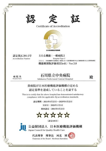 石川県立中央病院は、(公財)日本医療機能評価機構の定める認定基準を達成していることを証する認定証の交付を受けています。
